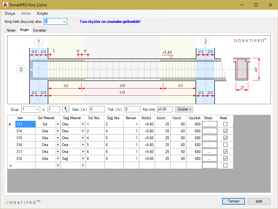 Kiriş datalarını Donatıpro™ kiriş arayüz penceresini kullanarak, EXCEL tablosundan