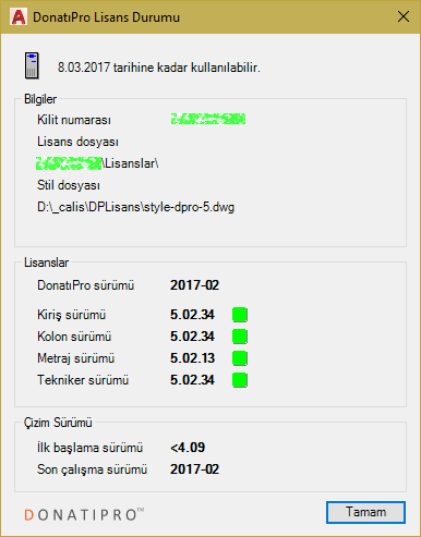 Donatıpro™ kullanıcı başına lisans modelini kullanır. Her kullanıcı için sahip olduğu modüllerin tanımlı olduğu lisans dosyası oluşturulur ve bir adet donanım kilidi verilir. Kullanıcı progamı çalıştırdığında Donatıpro™ çevrimiçi lisans dosyanızı kontrol eder ve donanım kilidinize yükler. Bu lisansları 7 gün boyunca kullanabilirsiniz. Donatıpro™ her çevrimiçi olduğunuzda bu işlemi tekrarlayacağı için hem lisanslarınız güncel kalır hem de 7 günlük çevrimdışı hakkınız yenilenir. Lisanslarınızın görünümü.